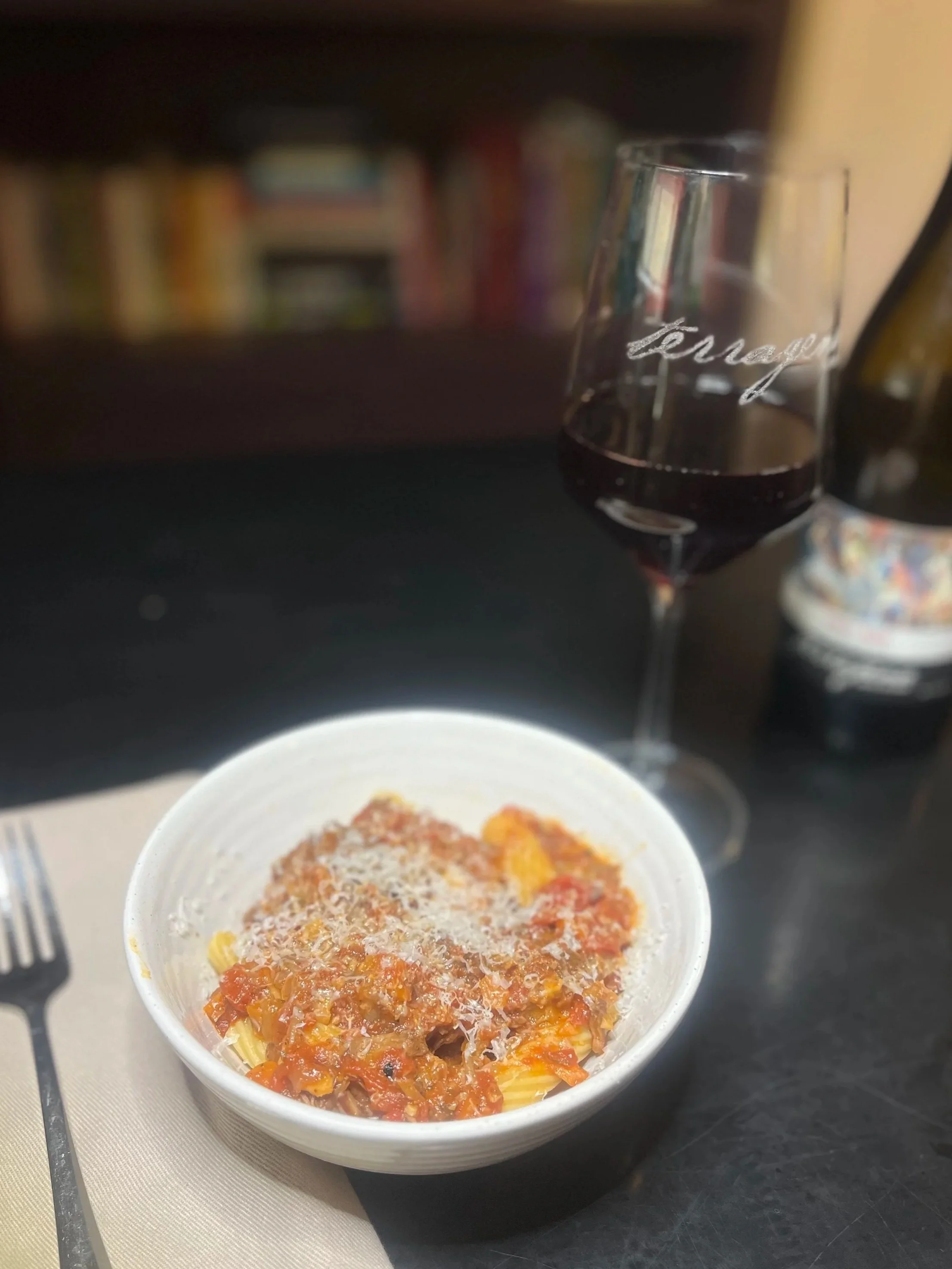 Top bowls of pasta with ragù and freshly grated parmesan cheese.